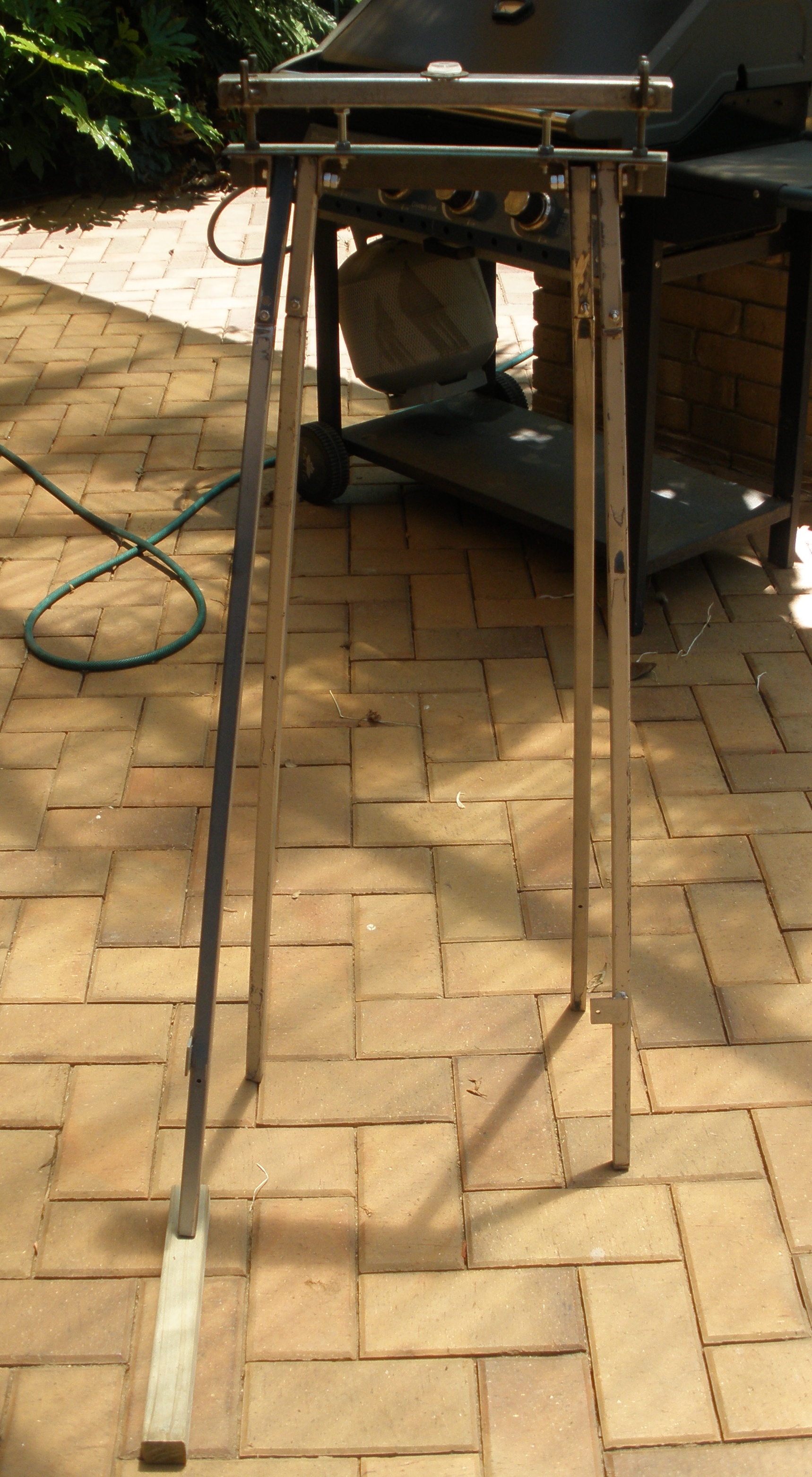 Description: Angled the legs out for stability and removed the cross braces. This has a 19mm 3/4" block under one foot to show how it self adjusts on uneven floors.